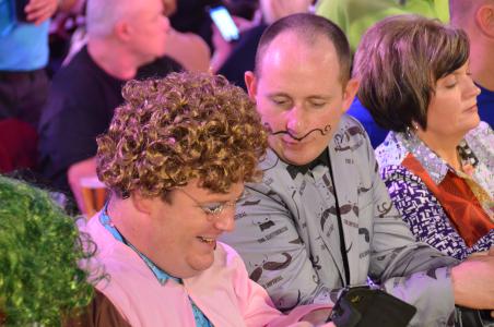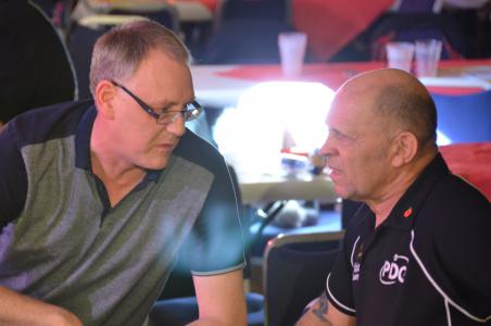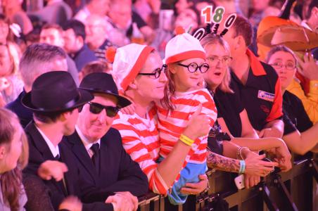 Das mit der Bühne ist gar nicht so ohne - man muss ja aufpassen, dass man den Filmkameras nicht in die Quere kommt, überall liegen Kabel herum, es stehen vorübergehend nicht gebrauchte Stative an diversen Stellen und nicht überall hat die Bühne ein Geländer. Bisher haben wir das aber alle gut überstanden. Ich habe keine Ahnung, ob die Spieler dadurch irgendwie irritiert sind wenn wir auf der Bühne stehen. Auch wenn wir schwarz gekleidet sind, ist es ja nicht so, dass man uns gar nicht sehen könnte. Auf jeden Fall hat von der Bühne einen ganz guten Überblick über das Geschehen und ich konnte sehen, dass am ersten Tag die Halle wirklich sehr von war, auch die "oberen Ränge" während es am Sonntag Nachmittag schon etwas leerer war und am Abend die Ränge gar nicht mehr besetzt waren. Außerdem hat man auch einen guten Blick auf den VIP Bereich und in diesem Jahr saßen da tatsächlich auch einige der BDO "Oberen" dort, das hatte ich in den Jahren vorher nicht gesehen.