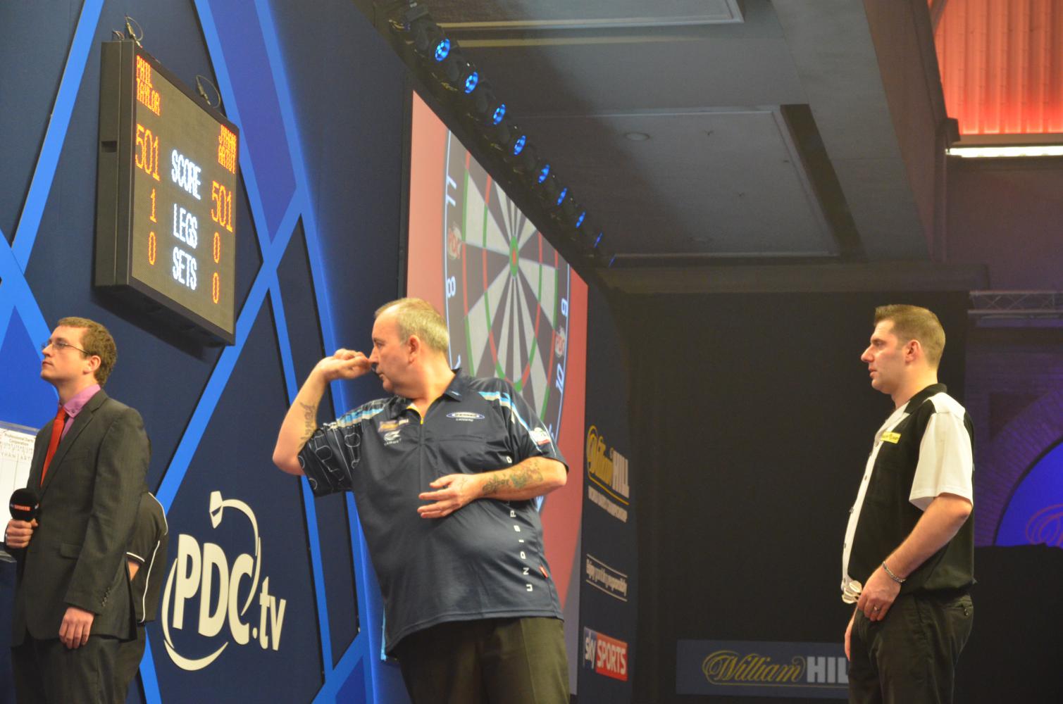 Dann tobte die Halle noch mehr als sonst, weil Phil Taylor erwartet wurde, der gegen den zweiten Deutschen Jyhan Artut antrat. Bevor die beiden anfingen, gab es zunächst Diskussionen darüber, ob das Dartboard schief hing oder nicht. Artut meinte ja, Taylor und Kirk Bevins sagten nein und damit war die Sache vom Tisch. Ob das Jyhan nachging oder er doch noch unter seiner Grippe litt, weiß ich nicht, weil ich ihn im Press Room nicht mehr antraf. Auf jeden Fall gingen die ersten beiden Sets komplett an ihm vorbei und obwohl er sich im dritten Set deutlich steigerte, war es einfach zu spät - bei diesem kurzen Format kann man es sich gegen Phil Taylor nicht erlauben, zwei Sets abzugeben. Taylor ärgerte sich hinterher ein bisschen darüber, dass er im dritten Set irgendwie die Konzentration verloren hatte, aber wahrscheinlich hatte er da Jyhan bereits abgeschrieben.