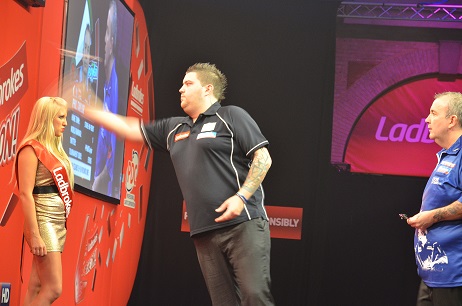 Begonnen hatte der Abend - der erste Abend mit Zweitrundenspielen - eigentlich ganz "normal": Peter Wright schlug Per Laursen, Raymond van Barneveld gewann gegen Jamie Caven, musste sich allerdings dabei ziemlich anstrengen. Vielleicht war es Caven nicht bekommen, dass er beim Walk-On nicht nur seine Frau sondern auch eine sichtlich überraschte Frau Barneveld küsste.