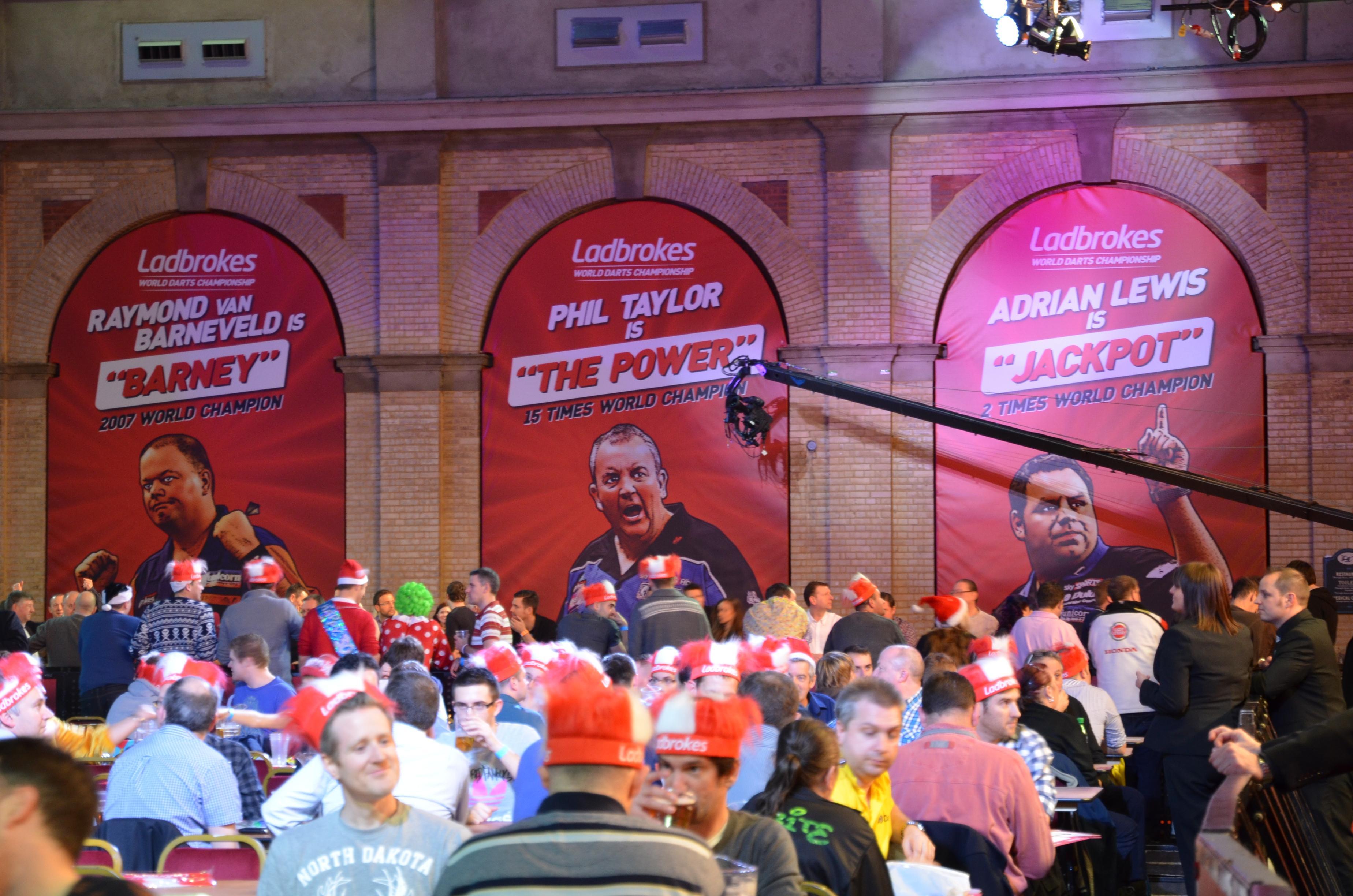 Die nächste Wo Frage, die ich jetzt auch beantworten kann ist: "Wohin hat eigentlich John Part während seines Spiels gegen Joe Cullen immer geschaut?" Na ja, nach links weil dort nämlich diese Riesenbanner mit Bildern der Weltmeister hängen. Da hing eigentlich auch immer eines von John Part, aber das ist dieses Jahr einfach verschwunden. Aus welchen Gründen ist nicht bekannt, es hat auf jeden Fall John Part berechtigt verärgert, was aber seinem Spiel nicht geschadet hat. Ganz im Gegenteil - er hatte mir ja selbst einmal erzählt, dass er besser spielt, wenn er verärgert ist. Jetzt hoffe ich einmal, dass er sich bei dieser Weltmeisterschaft noch ziemlich lange ärgern wird.