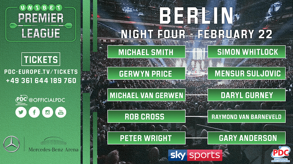 Der neue PDC Weltmeister Rob Cross wird gleich am ersten Spieltag, dem 1. Februar, in Dublin auf Michael van Gerwen treffen, den er in den Halbfinalen der PDC Weltmeisterschaft ausgeschaltet hatte. Der vierte Spieltag der diesjährigen Premier League wird am 22. Februar in Berlin stattfinden.