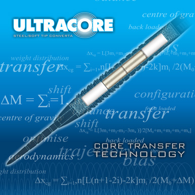 Unter den neuen Produkten in dieser Schatzkiste der Dartausrüstung sind auch die Ultra Core One Darts, ein neuartiges Steel und E-Dart Design, dass sich durch CTT oder Core Transfer Technique (= Kern Austausch Technik) auszeichnet. (Macht nicht mich dafür verantwortlich, der Bog Boss hatte seinen Abkürzungs- Generator eingeschaltet.) Was CTT tatsächlich meint ist, dass eine Auswahl austauschbarer Tungsten und Polymer Zylinder in unterschiedlicher Reihenfolge in den Barrel eingefügt werden können und so dem Spieler erlauben Balance und Gewicht entsprechend der persönlichen Erfordernisse zu tunen. Wenn irgendein neuer Dart einen eigenen Blog wert sein sollte, so ist es sicher dieser - ganz ohne Eigeninteresse im Übrigen, er ist hauptsächlich das Design des neuen Q und nicht meines.