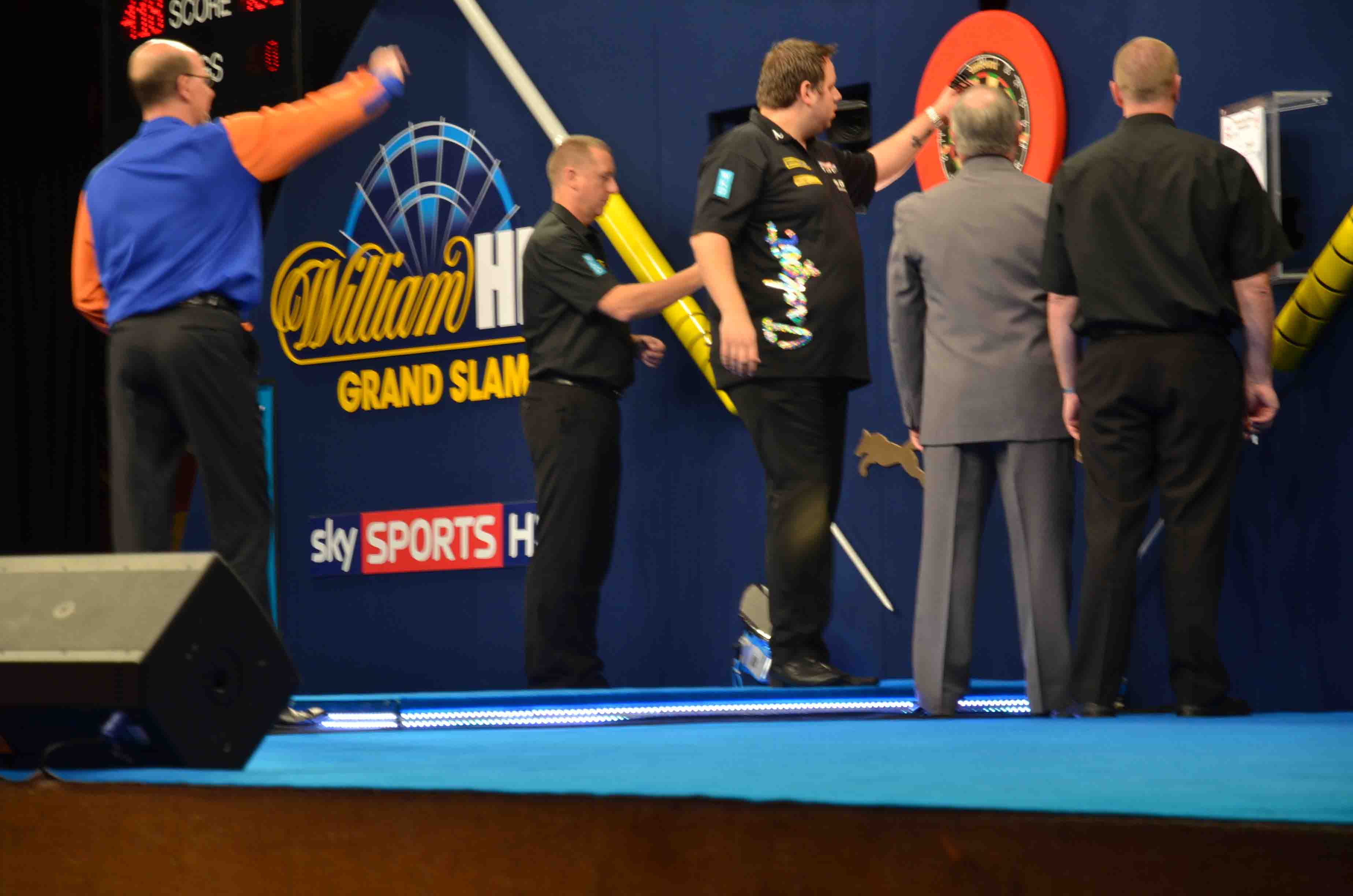 Taylor begann das Spiel mit einem sauberen 67er Finish, Beaton holte sich das zeite Leg mit der Doppel 10 nachdem Taylor die Doppel 16 nicht getroffen hatte. Auch im dritten Leg traf Taylor die Doppel 16 nicht und Beaton übernahm mit einem 120er Finish die Führung. Der dreimalige Grand Slam Champion glich mit der Doppel 16 aus und warf dann im fünften Leg zwei Maxima. Für einen Neun-Darter reichte es nicht, aber er gewann das Leg in 11 Dart und übernahm wieder die Führung. Beaton, der Taylor letztes Jahr in den Viertelfinalen geschlagen ahtte, sicherte sich das sechste Leg mit der Doppel 10, aber Taylor holte sich sofort die Führung zurück. Im achten Leg warf Beaton seine zweite 180, traf dann aber die Doppel 20 zum Legegwinn nicht und Taylort machte mit einem tollen 107er Checkout alles klar.