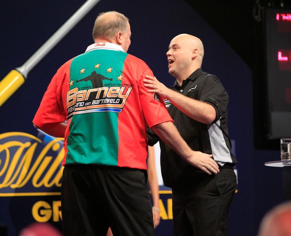 Lakeside Weltmeister Kist schlug den dreifachen Weltmeister Raymond van Barneveld in einem dramatischen Aufeinandertreffen mit 5:4. Van Barneveld vergab im entscheidenden Leg drei Matchdarts auf die Doppel 20 und Kist schnappte sich das Leg mit der Doppel 16 und blieb bei seinem Grand Slam Debüt weiter ungeschlagen.