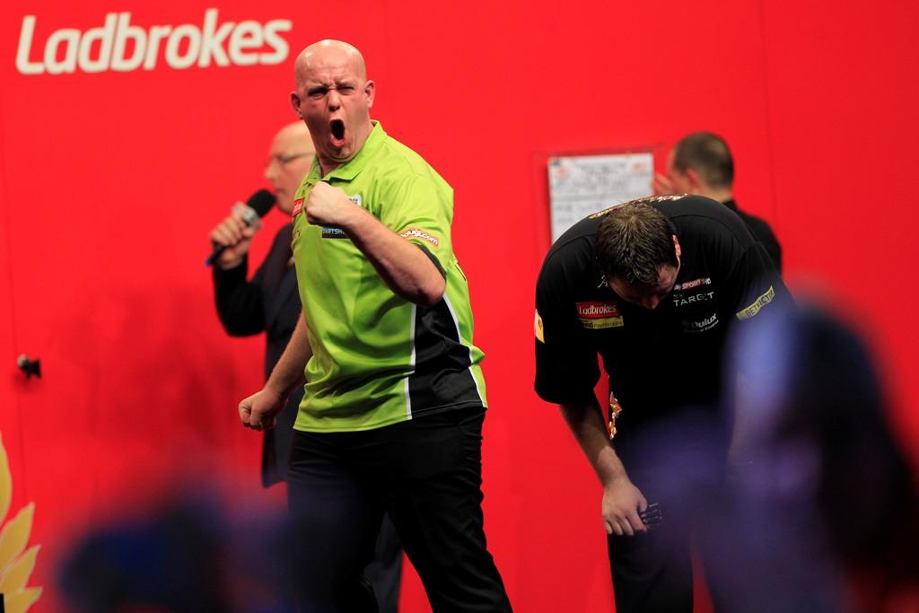 Das Spiel ging ständig hin und her, van Gerwen lag vier Mal in Führung, aber Adrian Lewis kam immer wieder zurück und schickte das Spiel in ein Entscheidunggset. Dort führte der Spieler aus Stoke mit 2:1 und verfehlte dann zwei Matchdarts auf die Doppel 20. Van Gerwen konnte erst ausgleichen und dann die folgenden beiden Legs zum Sieg holen.