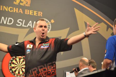 Michael van Gerwen, der 2012 im Finale des Grand Slam gestanden hat, kam gegen den Wildcard Qualifikanten Darren Webster gerade noch einmal mit dem Schrecken davon und gewann sein erstes Gruppenspiel in der Gruppe A knapp mit 5:4 während Adrian Lewis von Debütant Rowby-John Rodriguez geschlagen wurde.