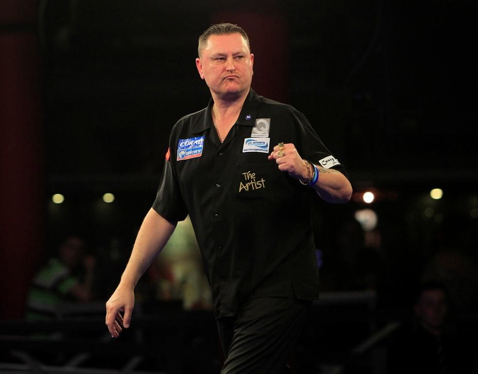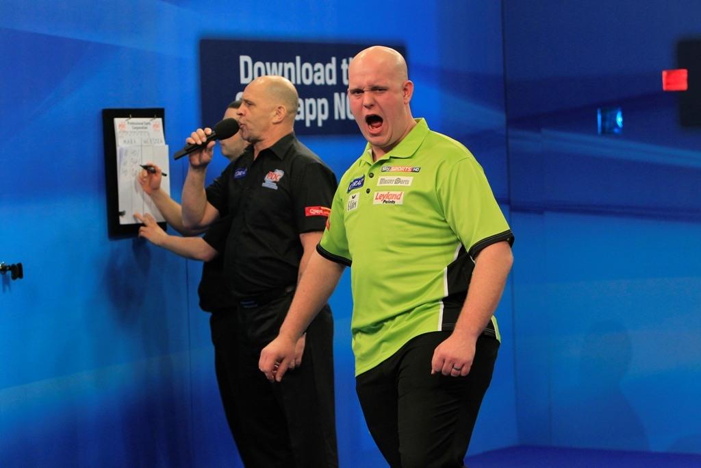 Weltmeister Michael van Gerwen zeigte eine gute Leistung und einen Durchschnitt von über 100. Er fegte Mark Webster mit seinem 9:4 Sieg förmlich beiseite und zog unter die letzten 8 des Turniers ein. Der Niederländer hatte zunächst mit 2:0 zurückgelegen, sich dann aber zum Ausgleich gegen den Waliser gekämpft. Webster holte sich noch einmal die Führung zurück, aber dann gewann van Gerwen mit zerstörerischer Kraft die folgenden sechs Legs und warf dabei auch zwei 13-Darter und einen 11-Darter. Webster konnte ihn Dank einer Doppel10 noch einmal kurz aufhalten, traf dann aber im nächsten Leg das Bullseye für sein Finish nicht und konnte nur noch zusehen, wie sein Gegner mit einer Doppel 8 in die Viertelfinale einzog.