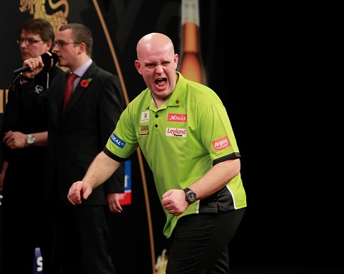 Die Nummer 1 der PDC Michael van Gerwen brauchte für seinen 5:0 Sieg über den Debütanten Mark Oosterhuis gerade einmal acht Minuten und beendete das Spiel mit einem 12- und einem 13-Darter und einem Durchschnitt von 102.95.