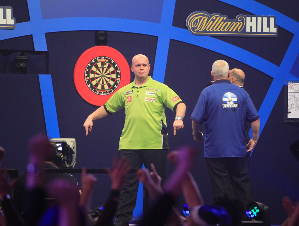 Titelverteidiger van Gerwen schlug Thornton in einem hochklassigen Spiel, in dem beide Spieler einen Durchschnitt von über 100 erzielten und in dem insgesamt 27 180er geworfen wurden, der Niederländer beendete das Spiel mit einem 170er Finish.