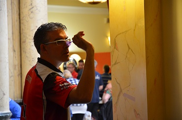 Das folgende Spiel zwischen Wesley Harms und dem Japaner Segio Asada entwickelte sich in einem fünf Set Thriller, in dem am Ende der Niederländer die Nase vorne hatte. Harms hatte im Spiel immer wieder Probleme, seine Doppel zu treffen, was Asada mit schöner Regelmäßigkeit bestrafte. Das erste Set hatte Harms gewonnen, im zweiten Set konnte der Japaner Harms Doppel-Schwäche nutzen und ausgleichen. Im dritten Set wurde Asada von Harm Problemen angesteckt und der Niederländer konnte das Set für sich entscheiden. Im vierten Set war es wieder der Japaner, der sich stark präsentierte und der mit einem 122er Bullseye Finish zum 2:2 ausgleichen konnte. Im entscheidenden fünften Set spürte der Japaner den Druck stärker als Harm, der noch dazu den Wurf in diesem Set hatte. Mit einer Doppel 10 rettete er sich über die Ziellinie.