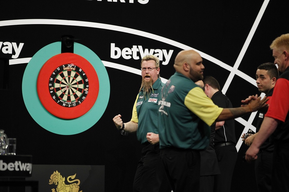 Australien wird in den Viertelfinalen am Samstagnachmittag gegen die Niederlande spielen - Michael van Gerwen schlug Gilbert Ulang von den Philippinen mit 4:2, Raymond van Barneveld setzte sich mit dem gleichen Ergebnis gegen Alex Taragao durch und ward dabei mit 101.75 den höchsten Durchschnitt des Tages.