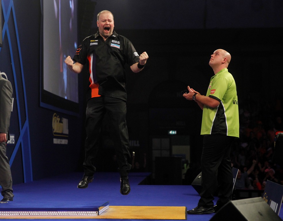 Die niederländische Legende Raymond van Barneveld warf die Nummer 1 der Welt Michael van Gerwen aus dem Turnier, indem er sich in einem sieben Set Thriller durch setzte, Titelverteidiger Gary Andersen und der zweifache Weltmeister Adrian Lewis sind hingegen eine Runde weiter.