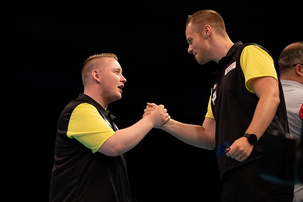 Das Team des Gastgeberlands Deutschland holte sich gegen Ungarn einen 5:1 Sieg obwohl sie das erste Leg des Spiels verloren hatten. Martin Schindler warf dabei im vierten Leg ein entscheidendes 137er Finish, das ihnen Spielraum verschaffte.
