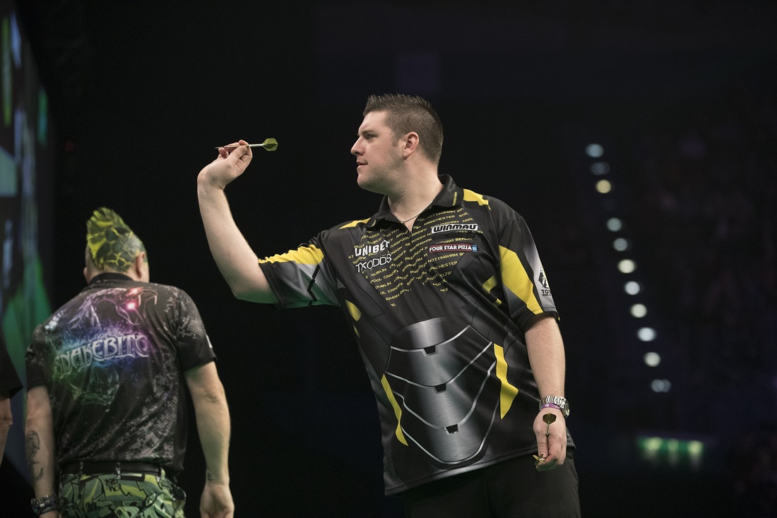 Daryl Gurney steigerte seinen Play-Off Hoffnungen mit einem eindrucksvollen 8:4 Sieg über Peter Wright, hatte dabei einen Durchschnitt von nahezu 100 und warf drei Finishs von über 100 Punkten. Für seine acht Doppel brauchte er lediglich 14 Versuche.