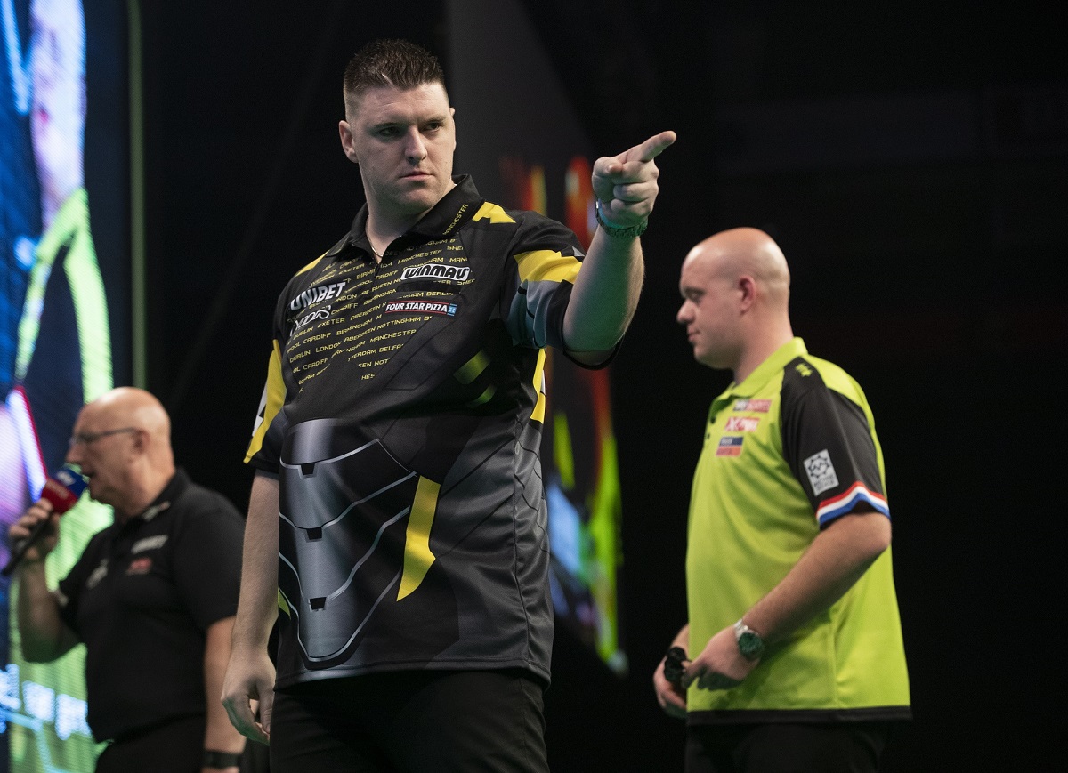 Gurney führte schnell mit 4:0 und machte unterwegs 105 und 76 Punkte gegen den Wurf aus. Dann kam van Gerwen mit einem 127er Checkout ins Spiel und holte sich gleich mit der Doppel 8 noch ein zweites Leg. Die folgenden beiden Legs gingen erneut an Gurney. Auch ein 130er Checkout von van Gerwen konnte den Iren nicht aufhalten, der sich das 7:4 holte und damit bereits einen Punkt sicher hatte. Van Gerwen konnte mit einem 100er Finish noch ein fünftes Leg holen, aber Gurney machte den Sack zu und hat jetzt nur noch einen Punkt Rückstand auf die Top Vier.