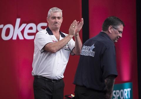 Anderson, der seit der Weltmeisterschaft von einer Rückenverletzung außer Gefecht gesetzt worden ist, warf mit seinen ersten drei Darts bei seiner Rückkehr auf die große Bühne eine 180, wurde aber schnell von Beaton in enges Gefecht verwickelt. Erst beim Stand von 5:5 gelang es Beaton sich nach einem 130er Bullseye Finish abzusetzen und dann mit einem 100er Checkout seinen Vorsprung auszubauen. Anderson kämpfte sich zwar zum 8:8 zurück, aber Beaton warf zwei 14-Darter und Anderson musste seine Hoffnungen auf die Titelverteidigung aufgeben.