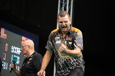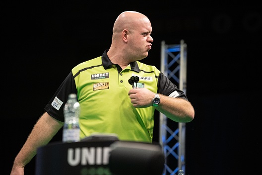 Der vierfache European Champion Michael van Gerwen spielte einen Durchschnitt von 103 und hatte eine Trefferquote von 50 Prozent auf die Doppel - er schlug Darius Labanauskas mit 6:1.