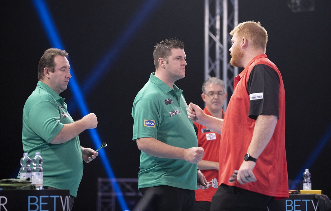 Die Finalisten von 2013 mussten erst einen 1:3 Rückstand aufholen um dann noch mit einem 5:4 Sieg über Tschechien in die zweite Runde einzuziehen. World Matchplay Sieger Dimitri van den Bergh und Kim Huybrechts konnten die Herausforderung durch Karel Sedlacek und Adam Gawlas gerade noch einmal abwehren.