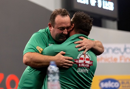Daryl Gurney an der Seite von Brendan Dolan sieht Nord Irland auf dem Weg zum Titel nachdem sie sich gegen die jungen Spieler aus Gibraltar - Justin Hewitt und Craig Galliano - durchsetzen konnten. Die beiden, die zusammen gerade einmal 40 Jahre alt sind, lebten in der parteiischen Atmosphäre in Frankfurt förmlich auf und konnten zum 3:3 ausgleichen. Damit schien ein eigentlich unmöglicher Sieg möglich zu sein, Aber Gurney spielte ein magisches siebtes Leg, indem er auf ein Maximum eine 135 Bullseye Finish zum 5:3 Entstand warf.