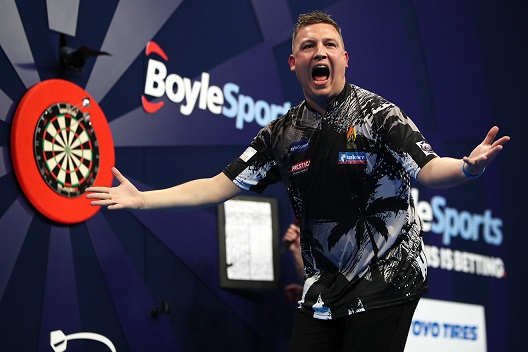 Van Gerwen wird in den Viertelfinalen am Freitag gegen Chris Dobey antreten, der sich in einem Sudden Death Leg gegen Adrian Lewis durchsetzte.