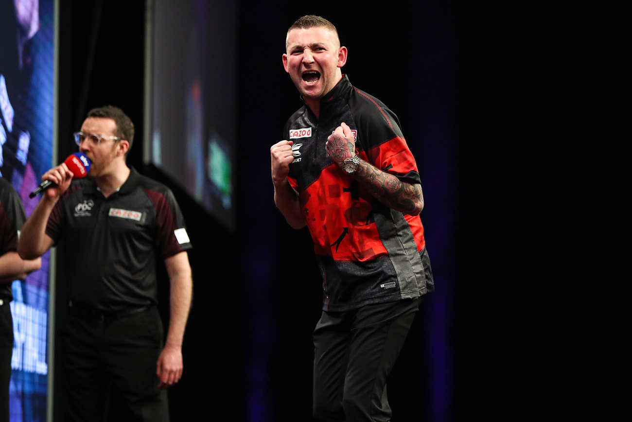 Der Weltmeister von 2021, gekleidet in die Nationalfarben, rächte sich an Nathan Aspinall für seine Niederlage am ersten Spieltag, holte sich die volle Punktzahl von fünf Punkten und den 10 000 Pfund Bonus für den Tagessieger.