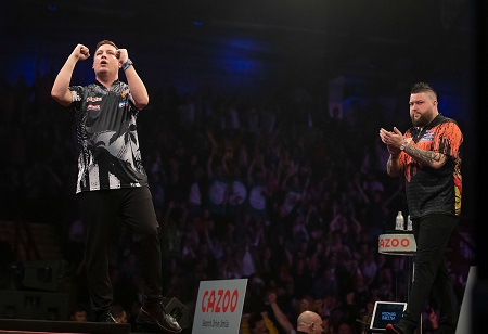 Aspinall beendete seine Dart Probleme mit Dimitri van den Bergh und konnte ihn zum ersten Mal nach 10 Niederlagen in Folge wieder schlagen. Dabei hatte er einen Durchschnitt von über 100 und warf sieben Maxima bevor er das dramatische Entscheidungsleg für sich entschied nachdem Van den Bergh einen Matchdart vergeben hatte. Aspinall festigte damit seine Position in den Top 4.