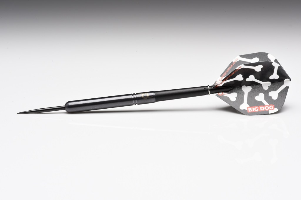 Inside the outer packaging you get a hard plastic case that contains the 3 darts in a point protector, a set of in-between length black nylon stems and a set of standard size Big Dog flights, which are pretty cool with the black background and white dog bones! The darts come fitted with 26mm (protruding) plain black coated points as standard. The darts themselves are pretty striking with the all black look. I am a fan of black darts so to me they look great.