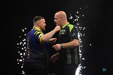 Littler schlug in der Uber Arena Stephen Bunting, Gerwyn Price und Michael van Gerwen und warf zwei 170 Checkouts, um van Gerwen im Finale des achten Spieltags mit 6:4 zu bezwingen.