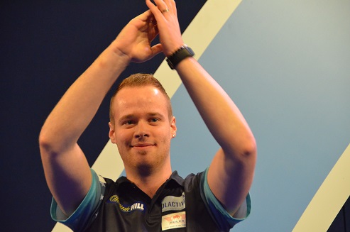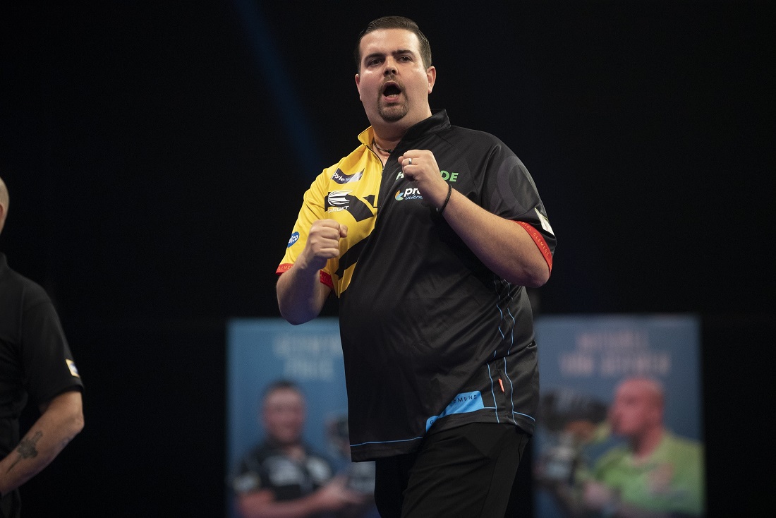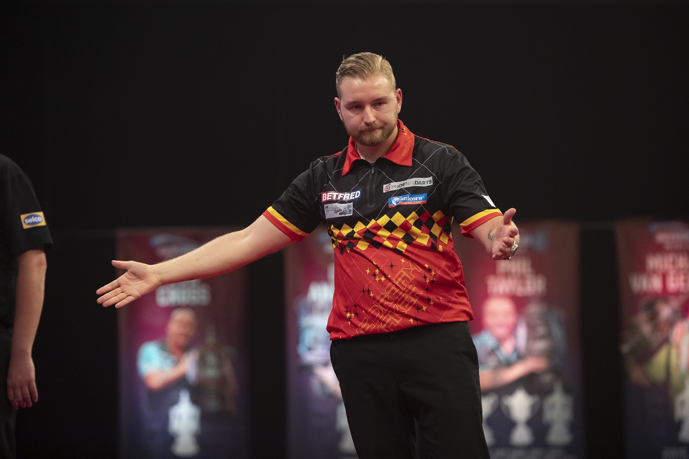 In the afternoon first a brilliant playing Simon Whitlock after a slow start defeated a strong playing Darius Labanauskas with 3:2 before the afternoon session ended with a surprise win of American Danny Baggish over Adrian Lewis. Tonight first a thrilling match between Rob Cross and Dirk van Duijvenbode followed which the Dutchman won. In the last match of the night Dimitri van den Bergh played against Paul Lim who had no chance from the start. Dimitri van den Bergh played very focussed an 105.61 average - the so far second highest of the tournament and defeated Lim with 3:0.