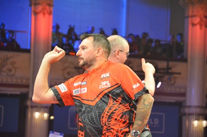 James Wade had looked really strong so far on TV but during the walk-on for the quarterfinals it seem he was not really comfaortable on the night. And really it was Gian van Veen who won the first three legs of the match. Wade found an answer throwing a 180 but somehow his accuracy on the doubles was not there and the Dutchman had a 4:1 lead going into the first break. Wade looked more settled after it and he managed to draw and finally to take over the lead but nothing looked as easy and and as natural as in his first two matches. Two times he had the chance to throw a perfect leg in the match but both times he failed. Wade stayed in front for the rest of the match, sometimes took a little break in the legs he didn't have the throw and played stronger in his own trying to keep van Veen at distance. When he was 15:13 in the lead one could see Wade definitely didn't want over time and he gave it all to get over the finishing line 16:13 - it was a good match from both players but probabyly Wade's weakest of the tournament.
