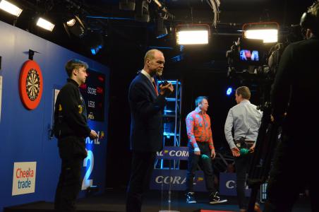 After the second semi-final the stage suddenly was full. The board was changed, a small table turned up and a person from dartconnect appeared and explained on a screen to Ned Boulting and Chris Mason how all the data is stored and how you can recall it, a young man with a cordless screwdriver watched in case the table would break down.Then ITV started to broadcast again and Boulting and Mason by now expertly explained the television viewers what the data can be used for..
