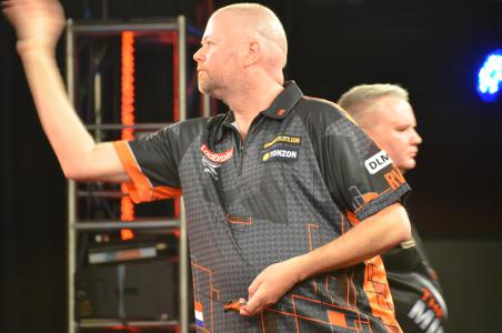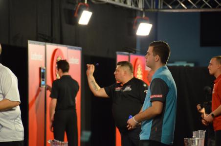 I don't know what happened after I left as I got stuck in Centre Stage for quite some time. A person had taken a fall on the steps and was treated by some paramedics - no one was allowed in or out for some time. So I watched the matches in there during that time and saw some one-sided matches with commanding wins by Madars Razma, James Wade, Kim Huybrechts, Jermaine Wattimena, Josh Payne and Jonny Clayton. When we were allowed to leave van Gerwen was out of the tournament.. At stage two the Lewis match had started which in fact was won by a Lewis - by Jamie Lewis. I didn't return to Centre stage but moved on with the crowd to the main stage where Gary Anderson just lost to Steve Beaton. It was a great match from both players but probably Anderson was a little bit rusty due to the break he had to take from darts because of his back injury. The last match of the fourth round was the match between Mensur Suljovic and Peter Wright. Wright gave it his best but it was not enough and he lost.