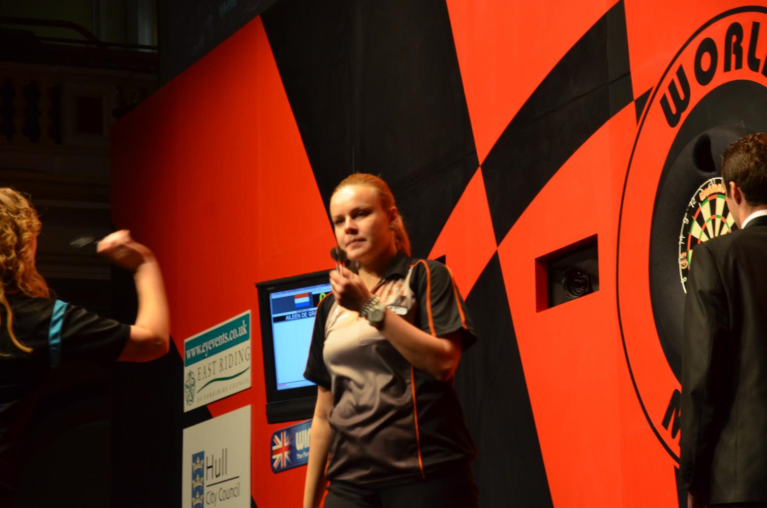 The second day in the City Hall in Hull was before me. The sun had come out again after a showery night when I started to walk down. This time a lot of young spectators were in the hall as the youth finals were played first. A lot of spectators were dressed up or did at least wear hats or glitter wigs which were sold at the BDO booth in the lobby.