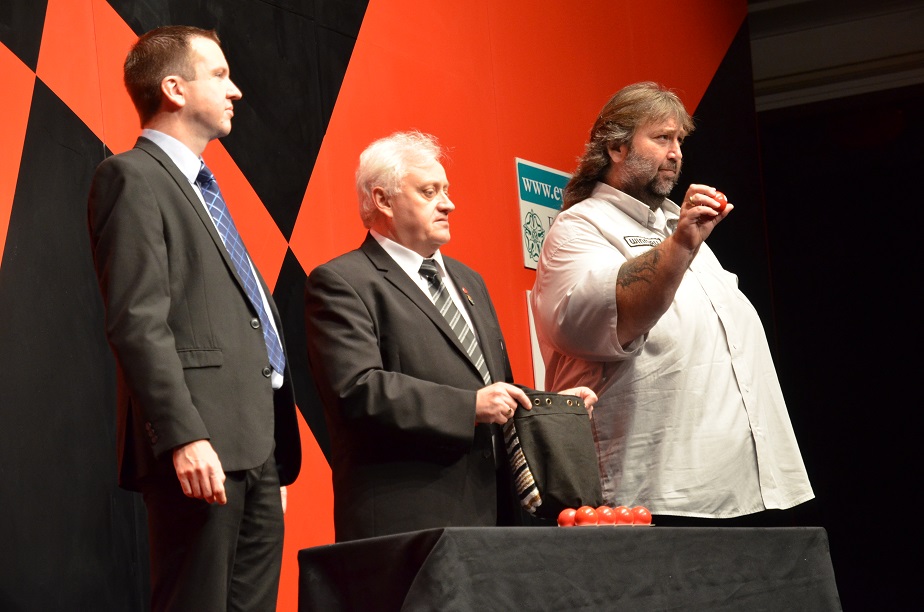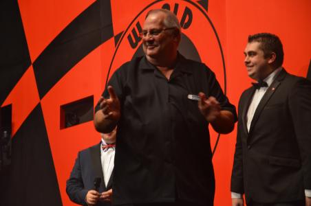 I went quite early to the venue as I had an appointment there with Patrick Chaplin - the doctor of darts. While we had exchanged quite a lot of e-mails over the years we never had met before. Well, we were to be sure far from having finished our conversation when the final of the WDDA World Championship started on stage - the very first time that such a match was played on the stage. The crowd followed it with interest and enthusiasm. Winner Ricky Chilton then played an exhibition match against Andy Fordham on stage and again the by Russ Strobel for wheelchair players developed wildfire frame was used.