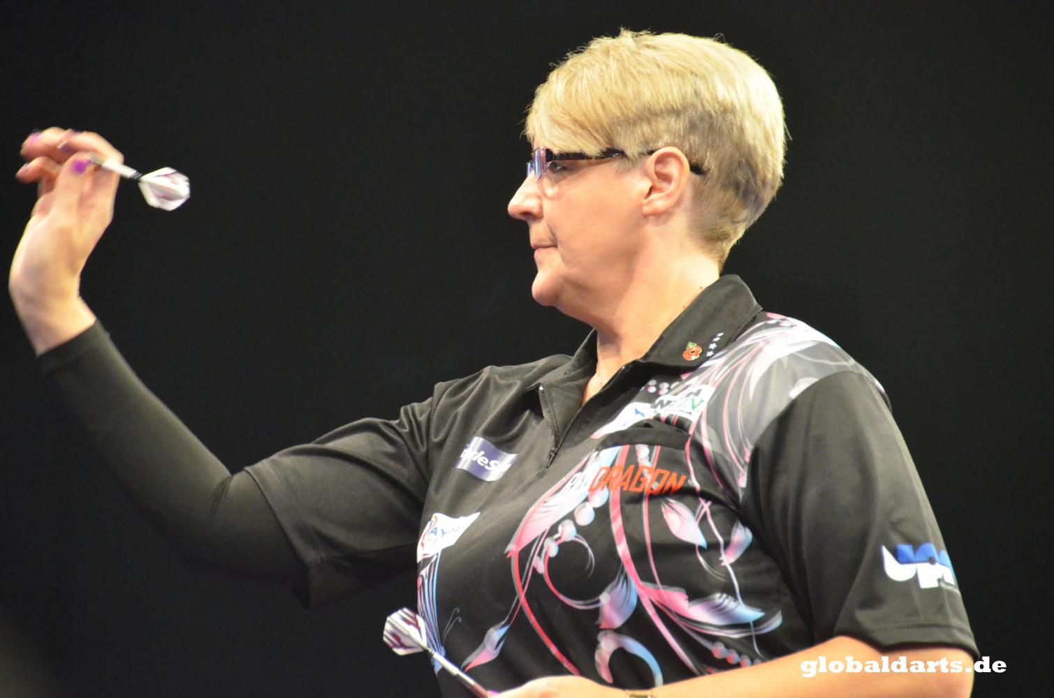 With Lisa Ashton followed one of two female BDO representatives. She played against Rob Cross, who looked like he was not quite sure what to do with a female opponent, especially when this was supported by the crowd. And so Cross was far from his best but still too good for Lisa Ashton though she could win two legs and threw the first 180 of the match in the second leg.