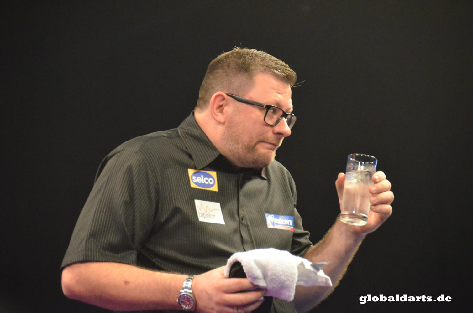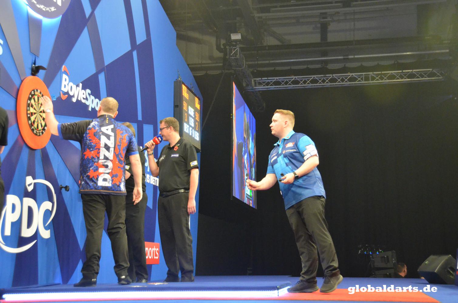This time the break between the two sessions was shorter and soon with Steve Lennon and Wesley Harms the first losers of the Groups A-D came on stage. None of the players played well. In the end Lennon prevailed 5:4. Next were Darren Webster and Dave Parletti. Webster was just better and played solid darts. After his win Webster explained that this time he had paid extra attention when infusing the water.