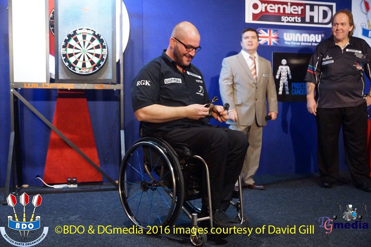 The day began with the WDDA final in which last year's winner Belgian Vince D'Hondt played against Englishman Richard Green. As D'Hondt plays sitting in a wheelchair while Green plays standing once again the wildfire board was in action which on one side has a board in the usual throwing height while on the other side is a board in wheelchair throwing height. Both players looked slightly tense and nervous though D'Hondt from the start dominated the match and impressed beside with his clinical finishing. So in the end with a 3:0 win he defended his title.