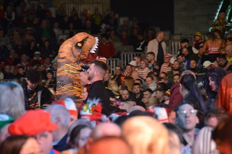 On the start of the evening-session the match between Aspinall and Cullen lured me to the Main Stage. It was more then crowded - Aspinall was on stage. But that was not all - the crowd was in a merry mood ignited by three dinosaurs cruising through the crowd which made everybody laugh and cheering. It was difficult to get the crowd's attention back to the stage - no one looked at the players or the officials - even when Russ Bray tried a fake 180. The players looked very amused as well. But finally the match went on and Aspinall had no problem to win against a Cullen under par. Might be dinosaurs played their part.